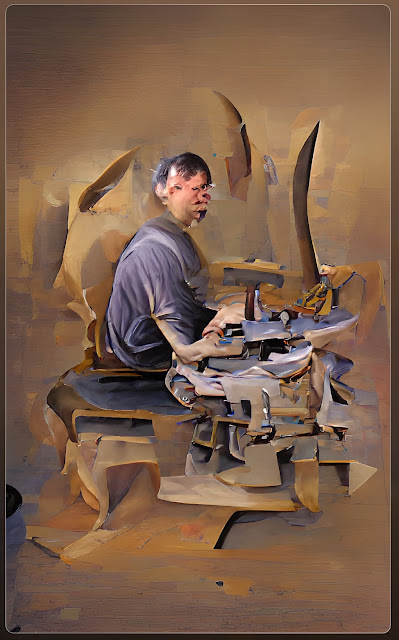 I asked an Artificial Intelligence Computer Algorithm to paint an abstract painting of a man sitting in front of a scroll saw. I swear I think it saw my messy shop and painted me! 😄